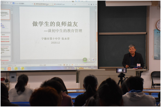 为了进一步增强同学们对中学德育现状的了解,让同学们有更深的思想政治素质和职业道德素养,培养出更多有理想信念、有道德情操、有扎实学识、有仁爱之心的教师队伍,公司于12月11日下午19:00在求实楼CC–202开展了“做员工的良师益友 ––谈员工管理”讲座。主讲老师为宁德市第十中学副董事长张永青。